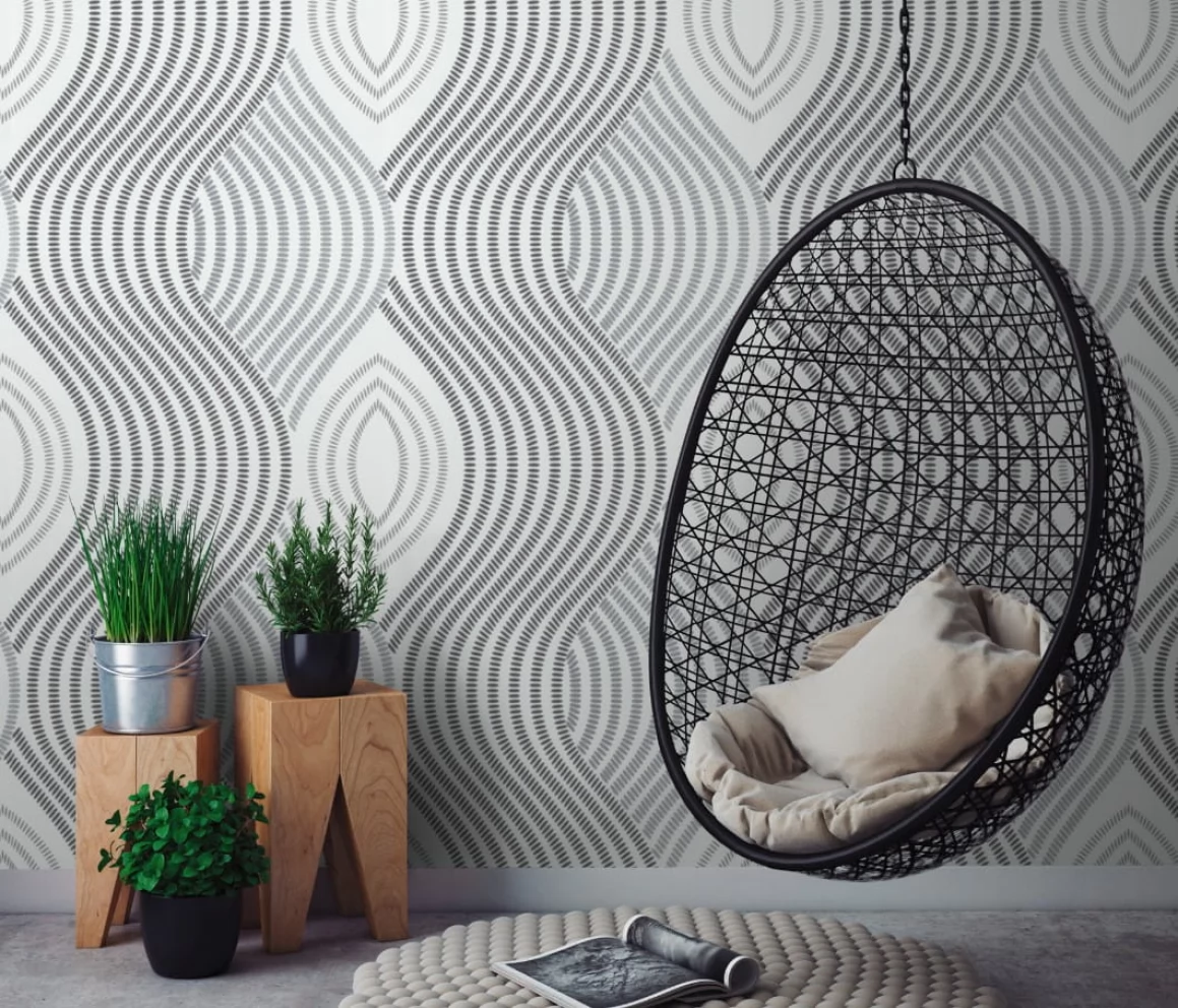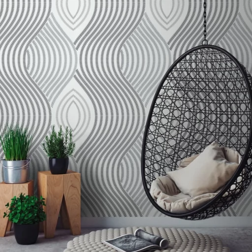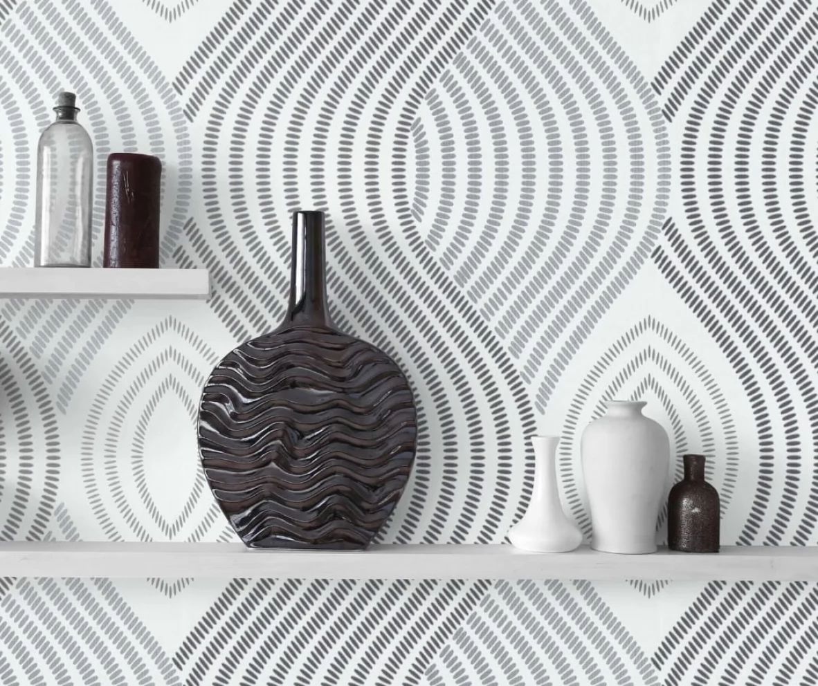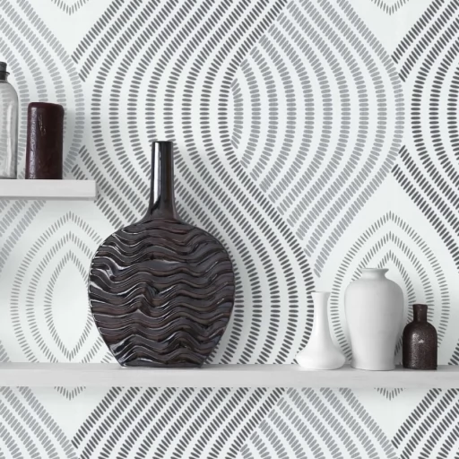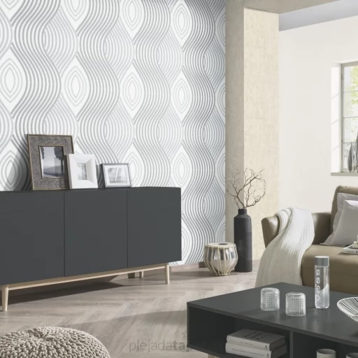Elegancka tapeta z geometrycznym motywem w odcieniu bieli i szarości z subtelnym połyskiem.