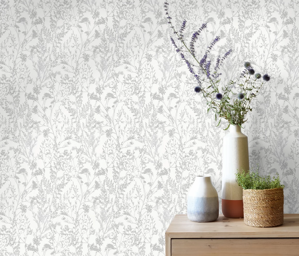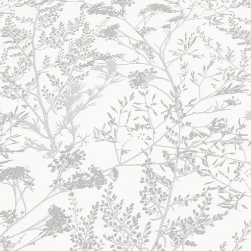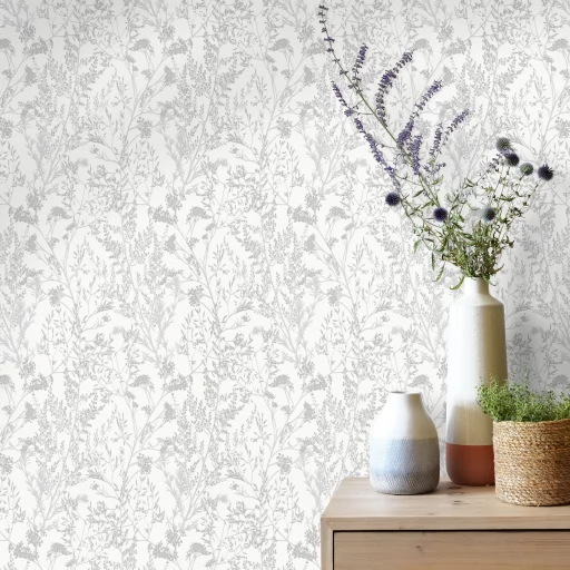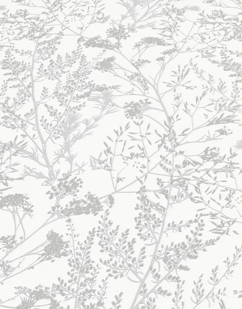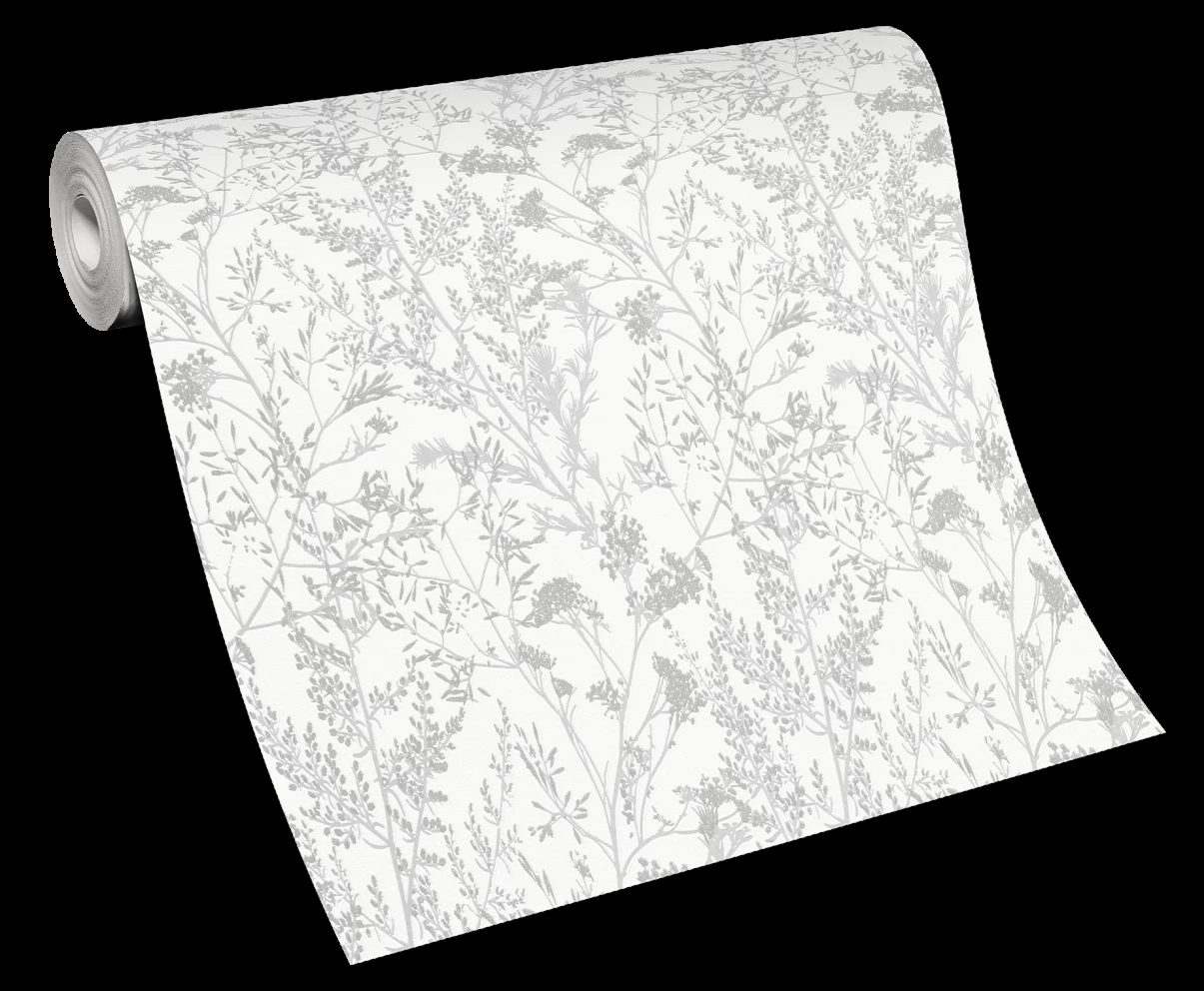 Elegancka tapeta z motywem drobnych kwiatuszków w odcieniach srebra i bieli.
