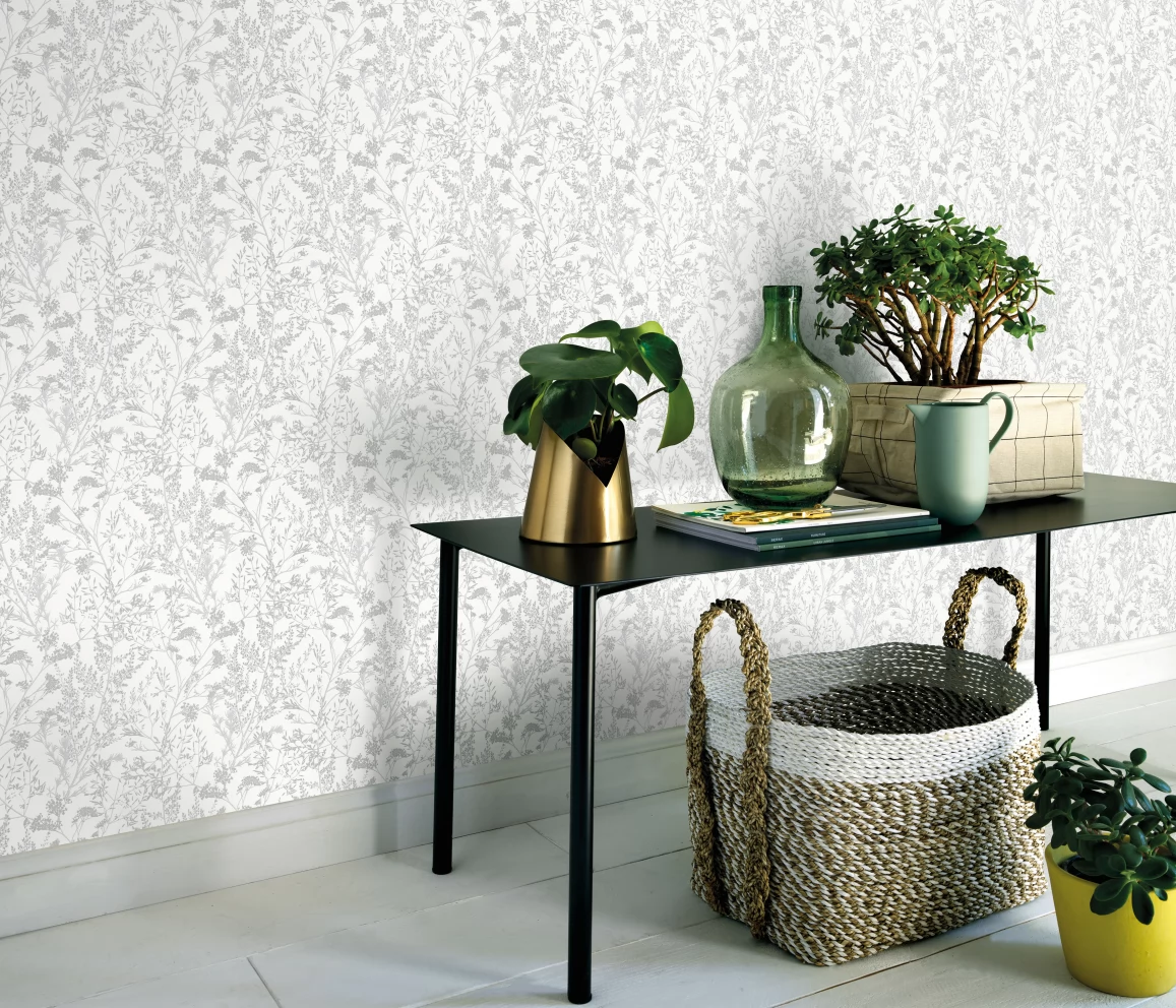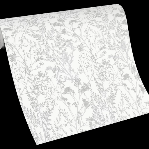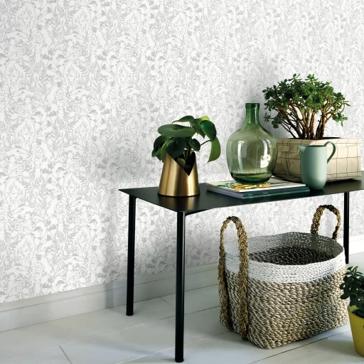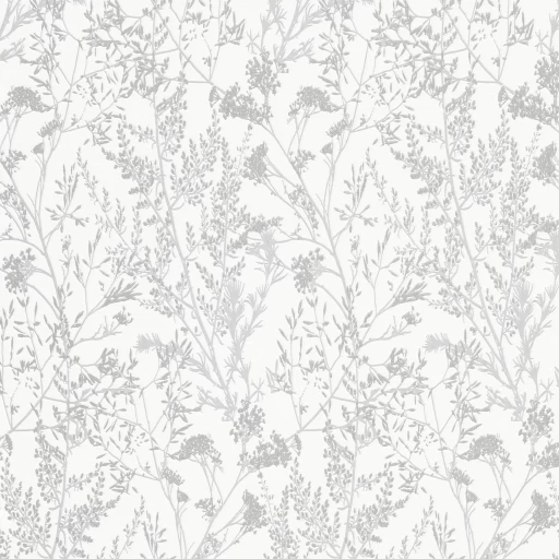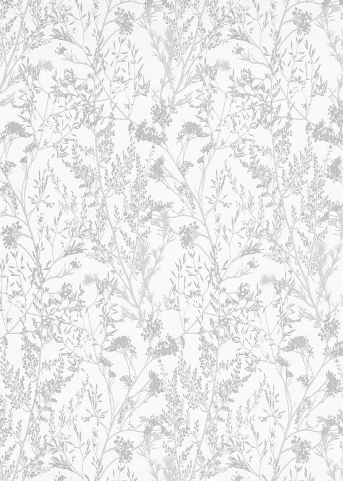 Elegancka tapeta z motywem drobnych kwiatuszków w odcieniach srebra i bieli.