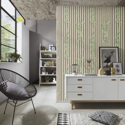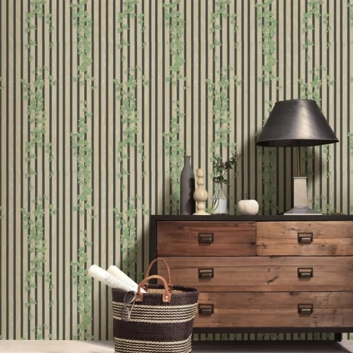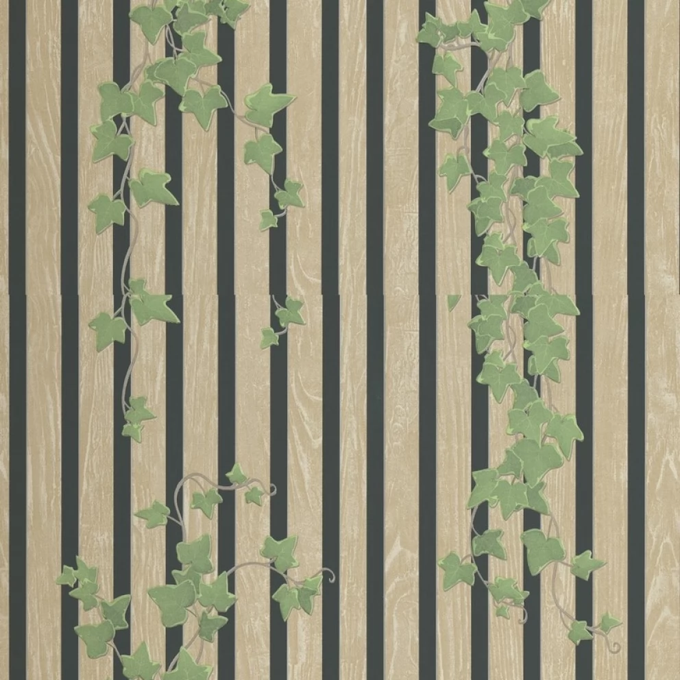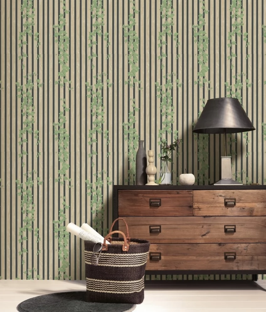 Winylowa, zmywalna tapeta niemieckiego producenta ERISMANN. Wzór dębowych lameli z efektem 3D przeplatanych bluszczem. Tapeta na podłożu z flizeliny - klej nakładamy tylko na ścianę.