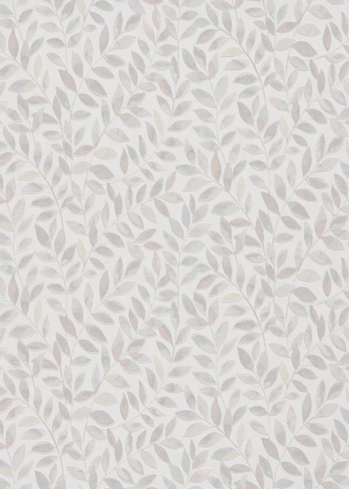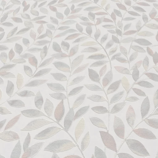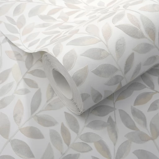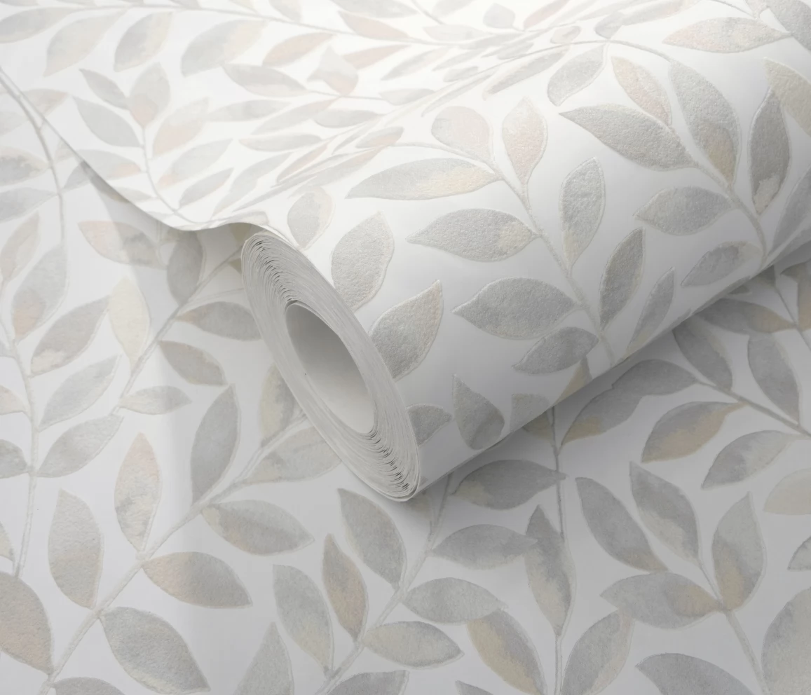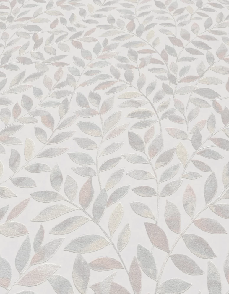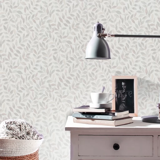 Elegancka tapeta z motywem drobnych listków w odcieniu beżu i szarości.