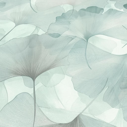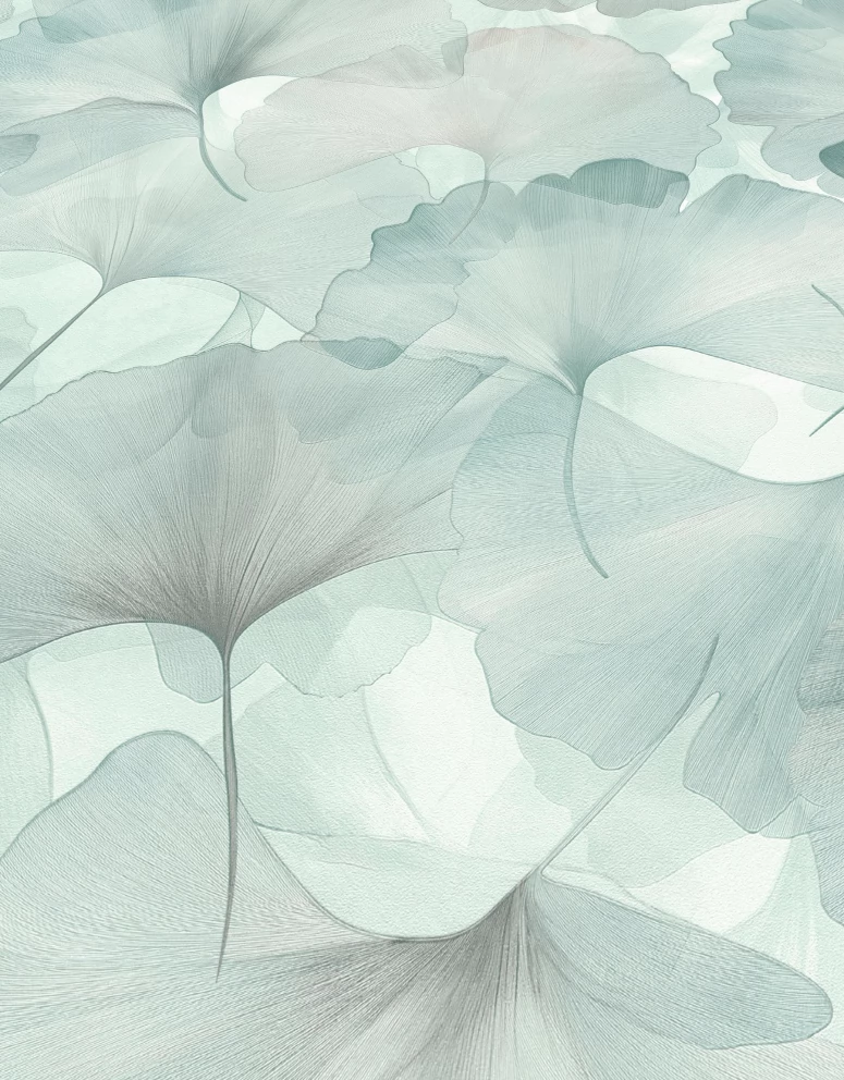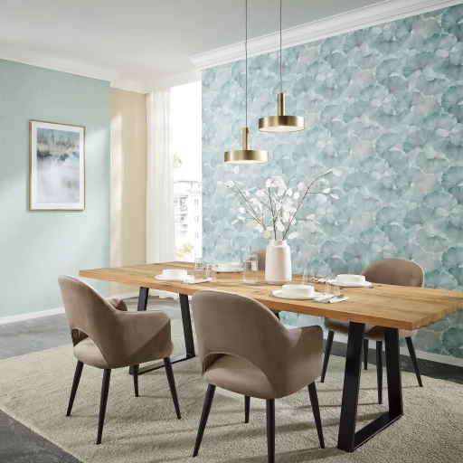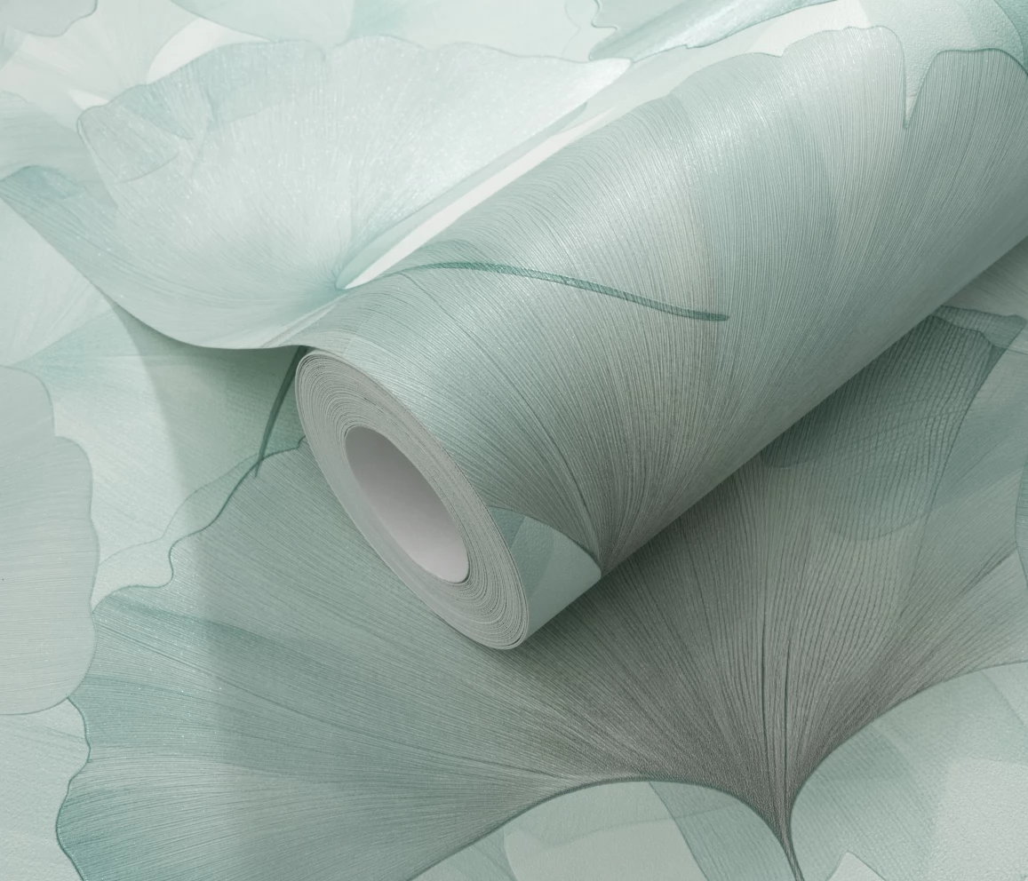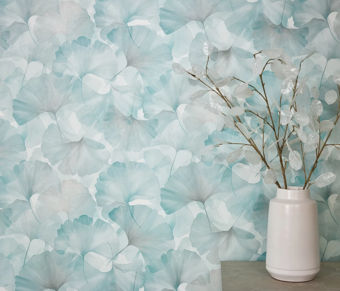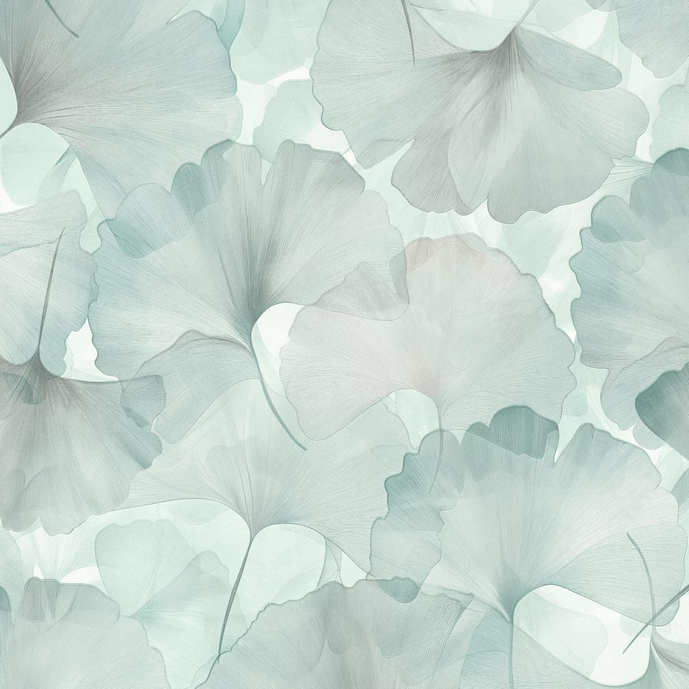 Tapeta niemieckiego producenta ERISMANN. Wzór kwiatów liści miłorzębu w pastelowym turkusie. Tapeta łatwa w montażu.