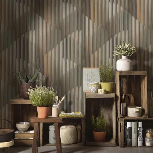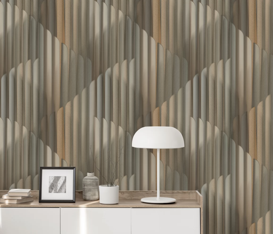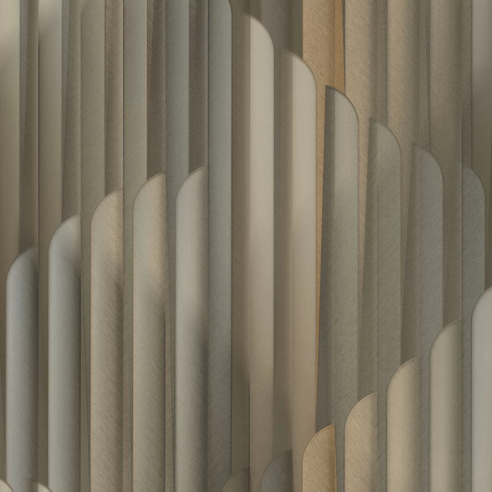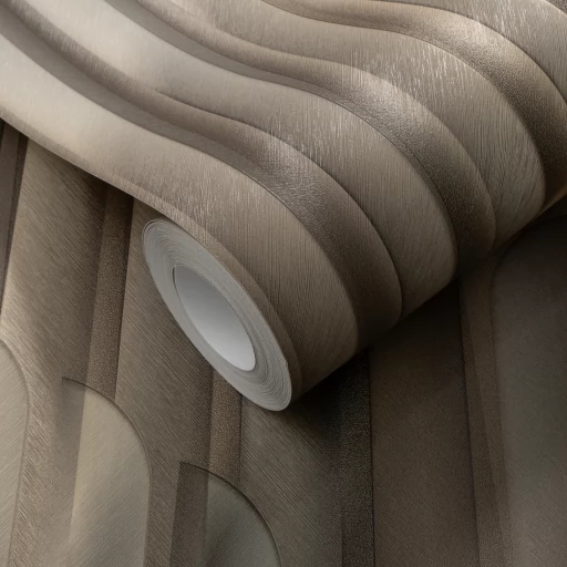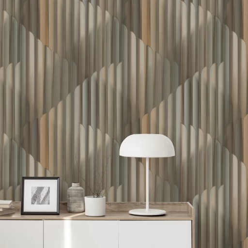 Elegancka tapeta z geometrycznym motywem w odcieniu beżu i szarości z subtelnym połyskiem.