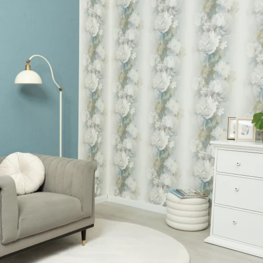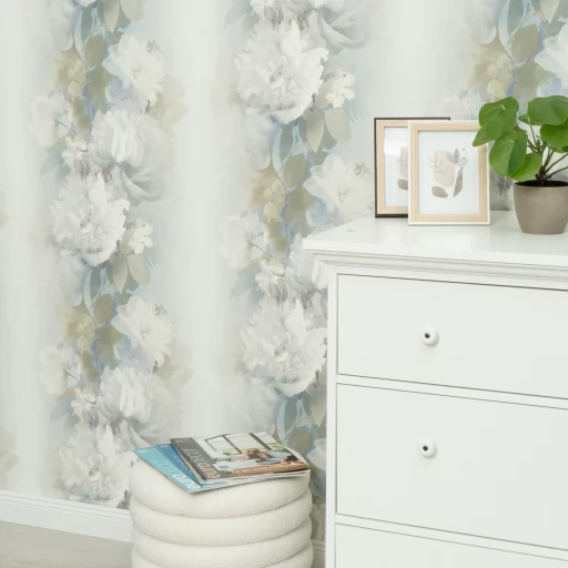 Tapeta niemieckiego producenta ERISMANN. Wzór kwiatowych girland układający się w efekt panelu na ścianie. Tapeta łatwa w montażu.