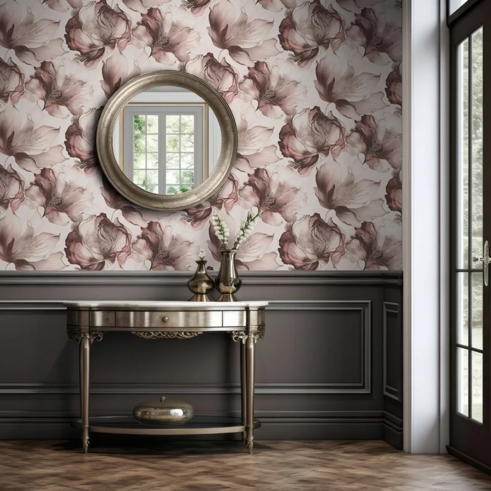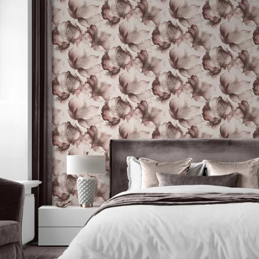 Wysokiej jakości papierowa tapeta francuskiej fabryki UGEPA. Elegancki motyw kwiatów w odcieniach burgundu ze złotymi dodatkami.