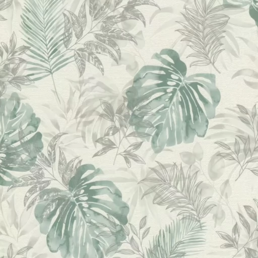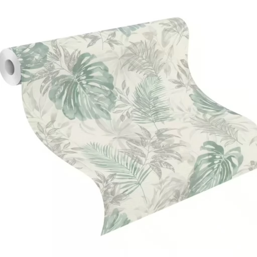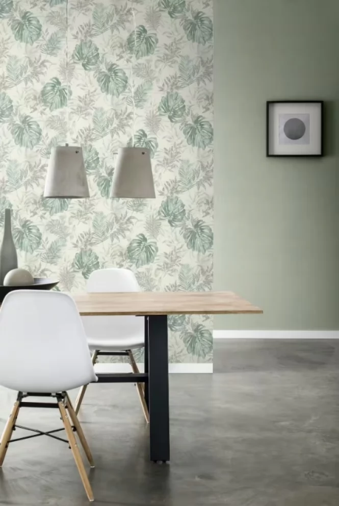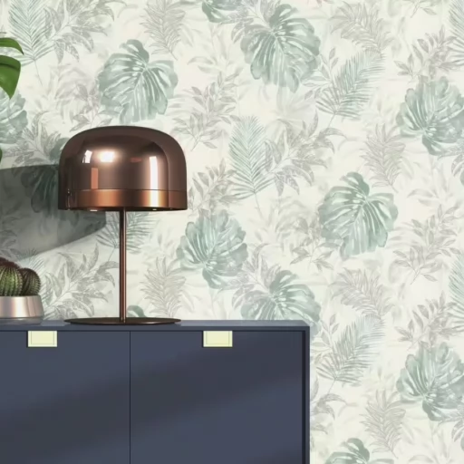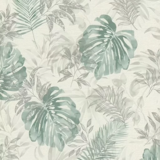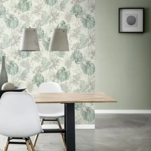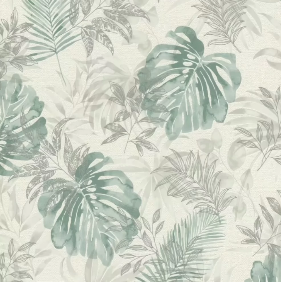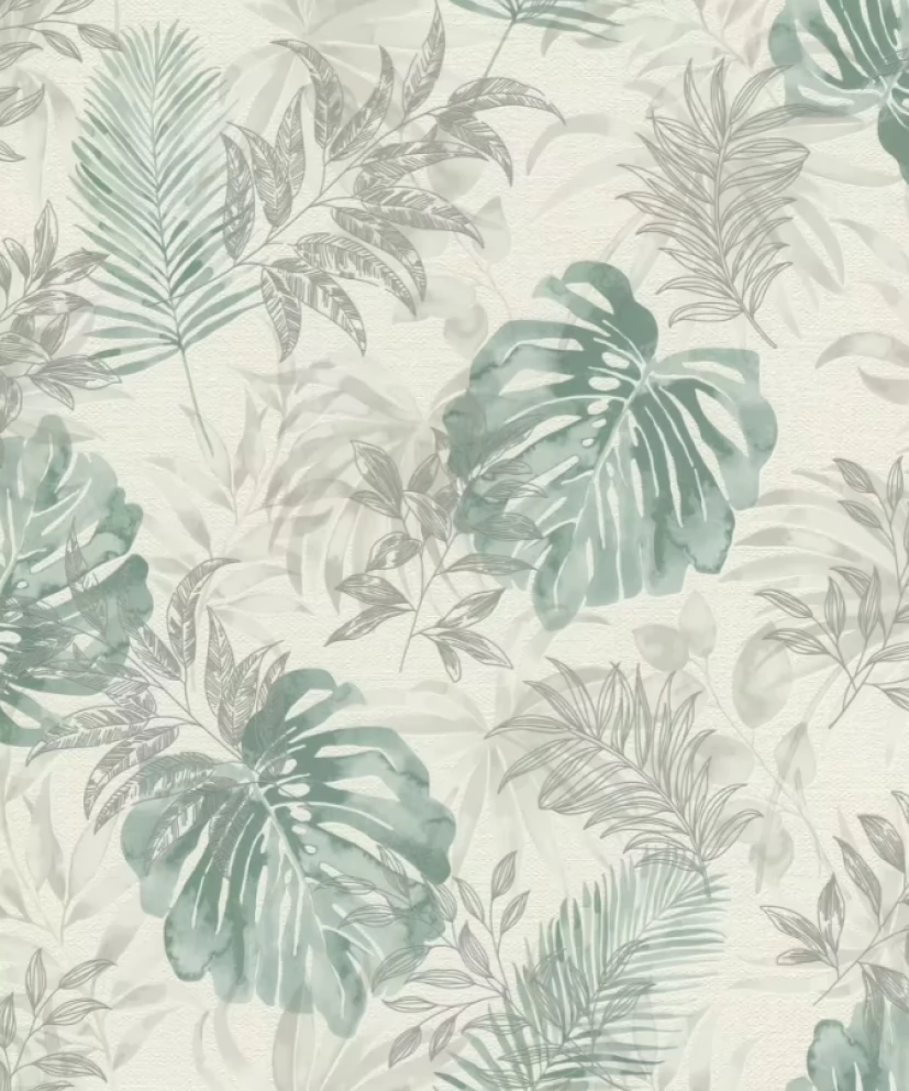 Elegancka i zarazem nowoczesna tapeta z motywem liści w odcieniu zieleni i szarości.