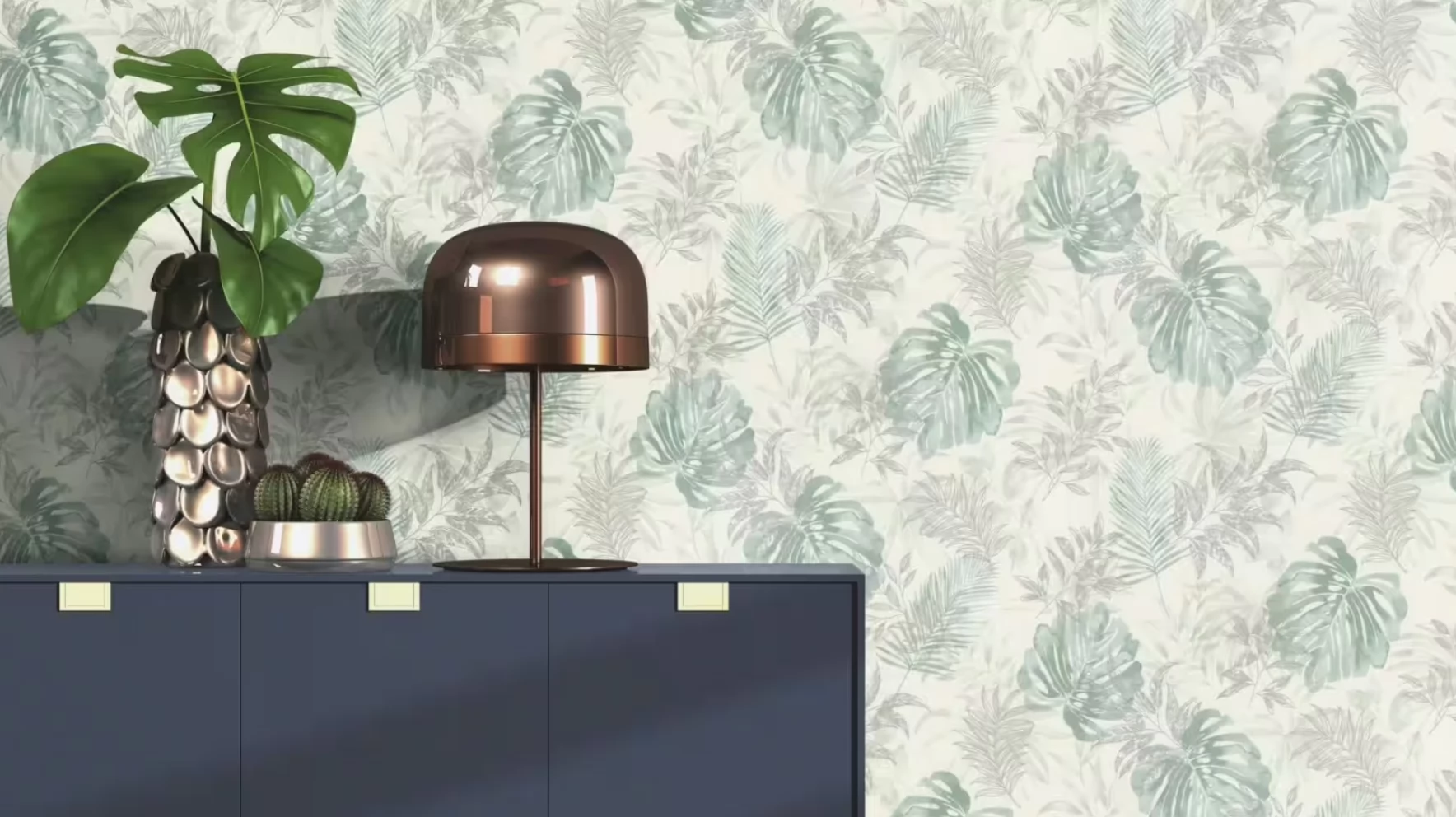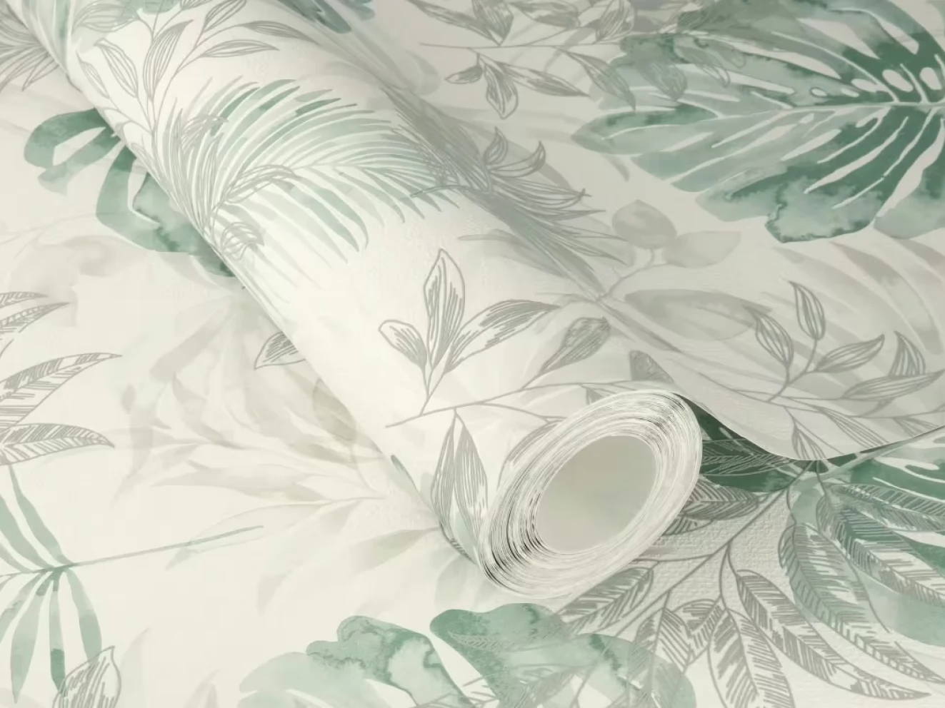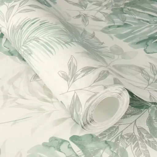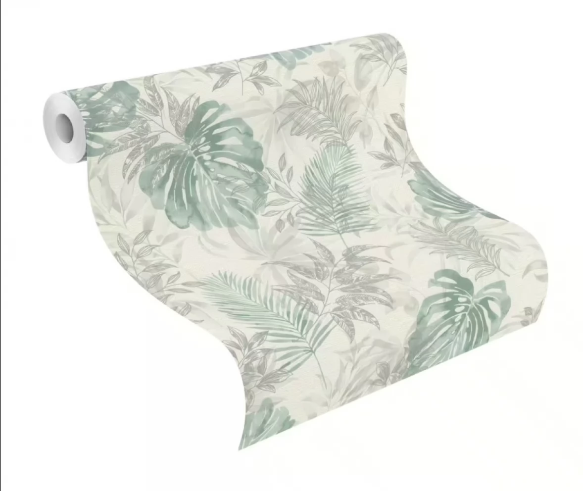 Elegancka i zarazem nowoczesna tapeta z motywem liści w odcieniu zieleni i szarości.