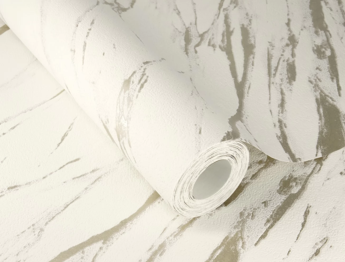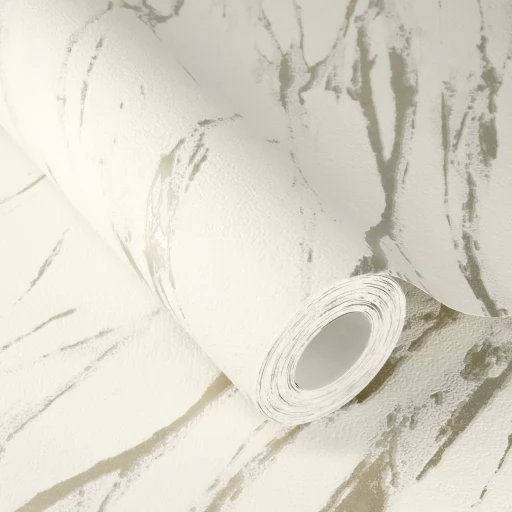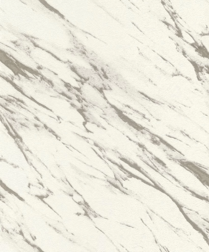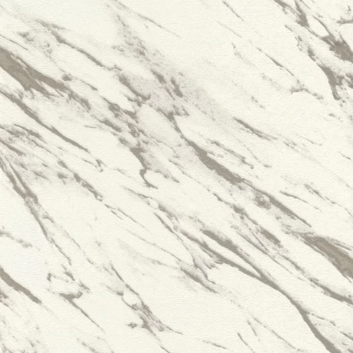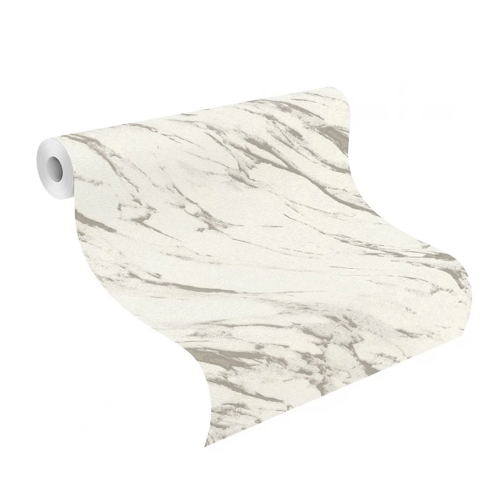 Motyw kamienia imitującego włoski marmur. Tapeta utrzymana w jasnej tonacji bieli i beżu z elementami lśniącej perły.