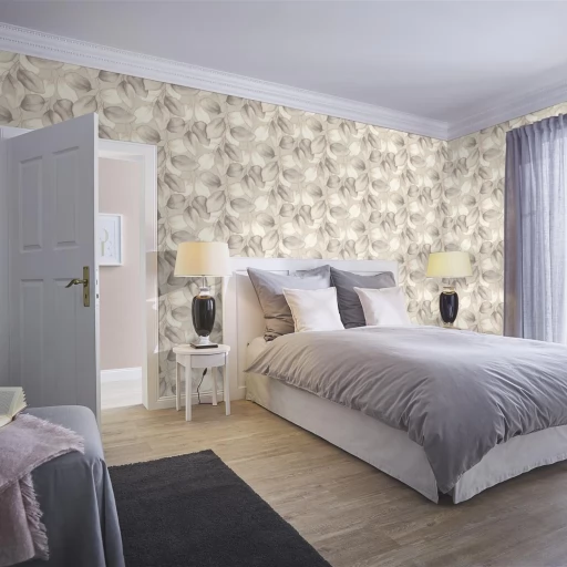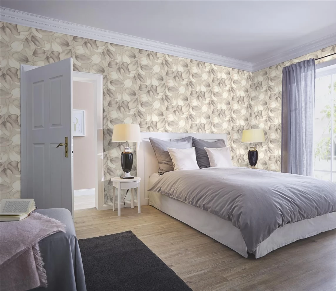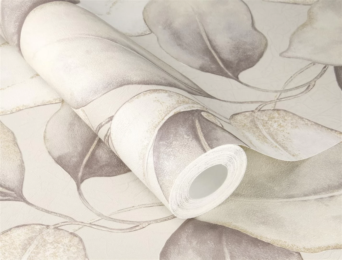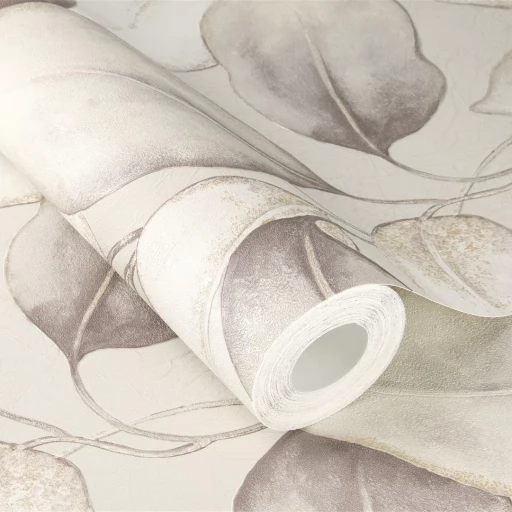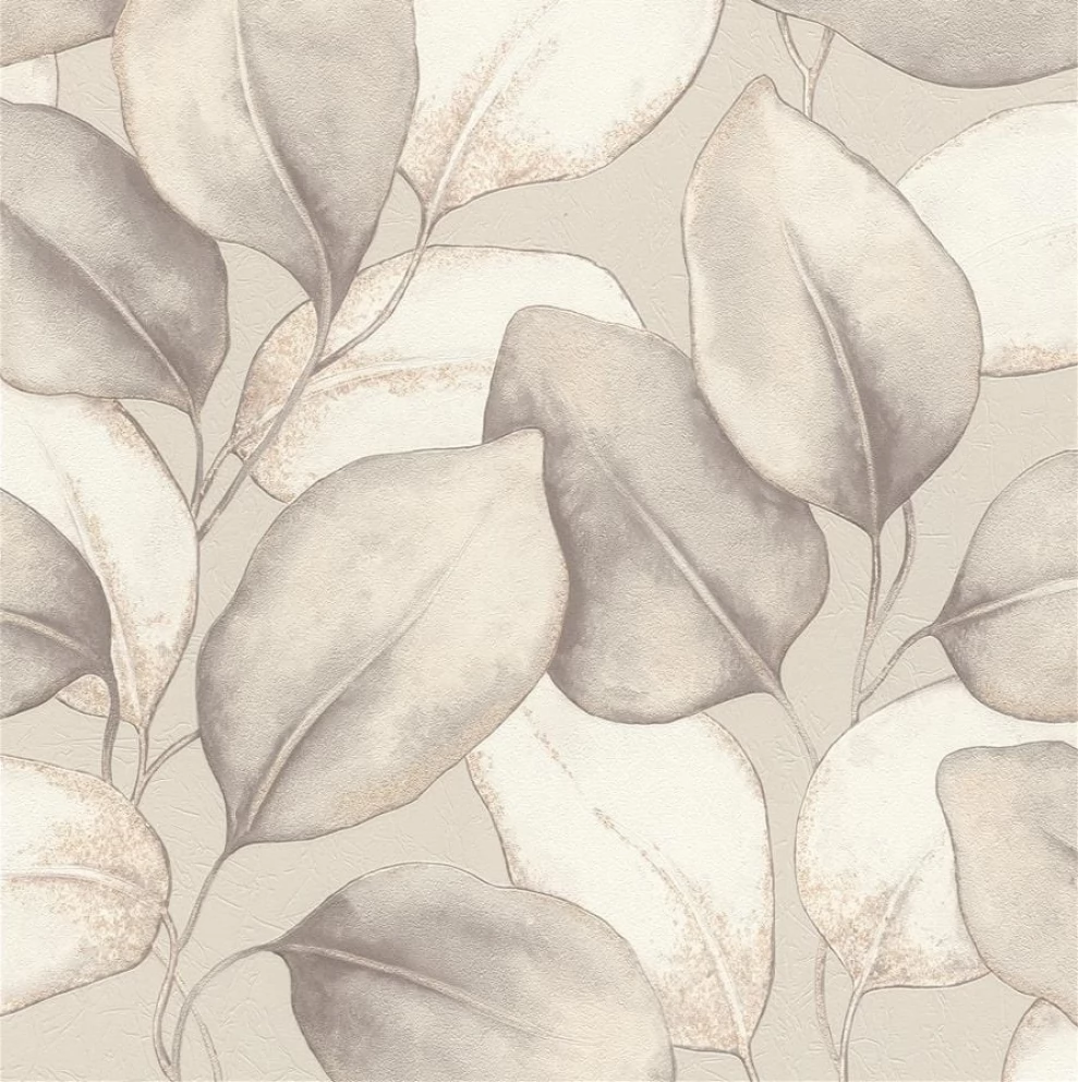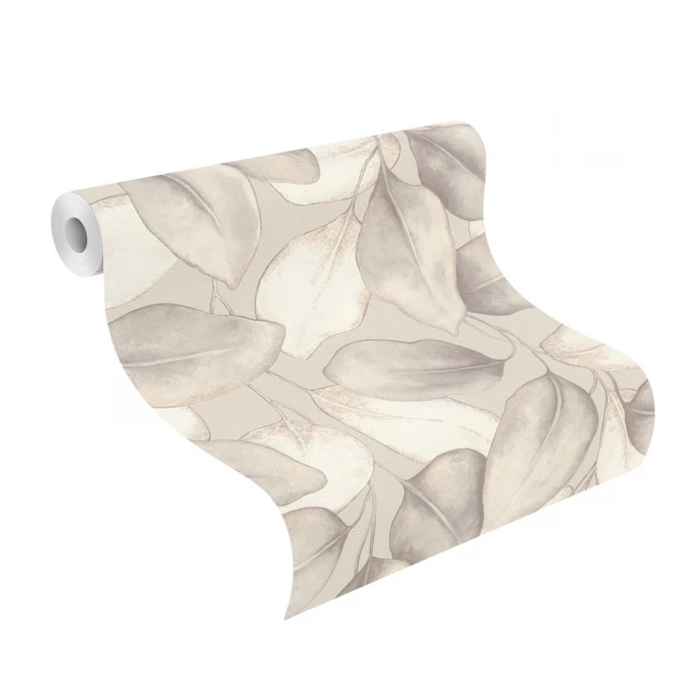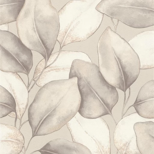 Elegancka tapeta z motywem liści w odcieniach beżu.