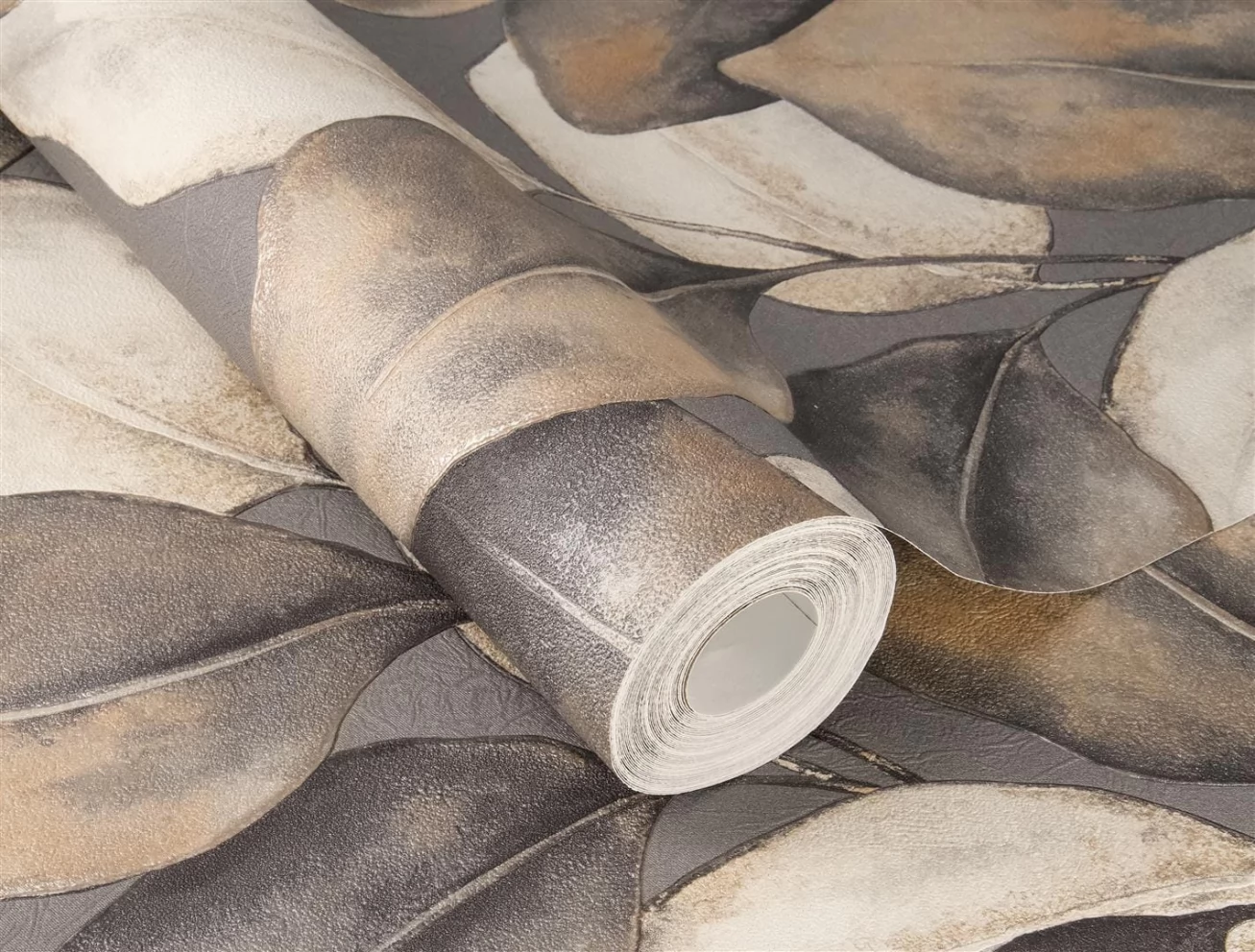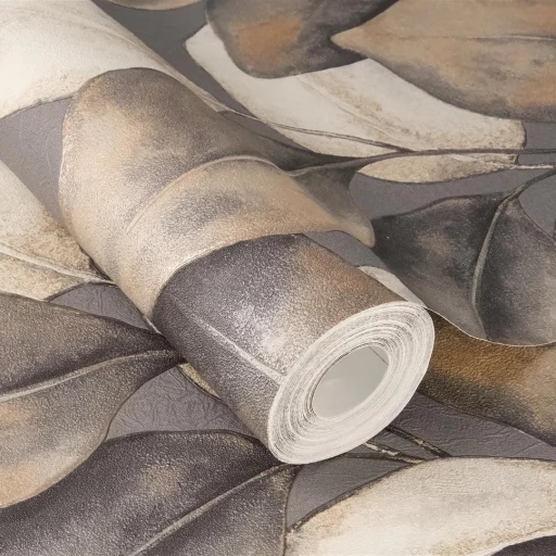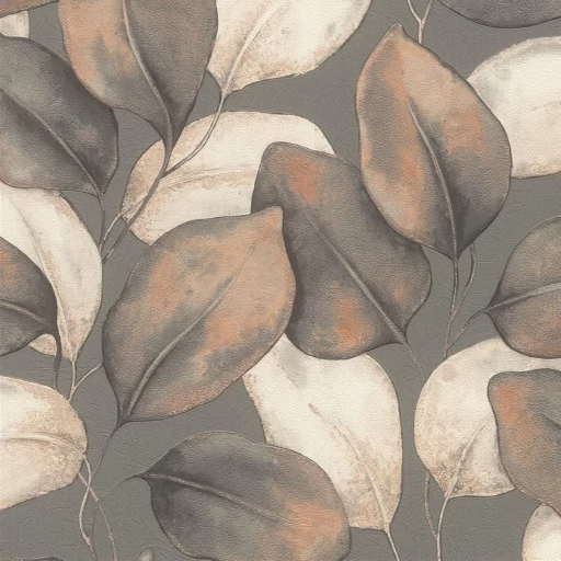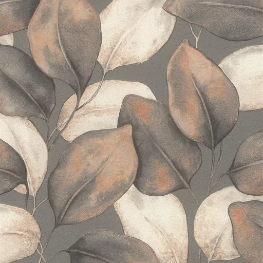 Elegancka tapeta z motywem liści w odcieniu beżu, brązu i szarości.