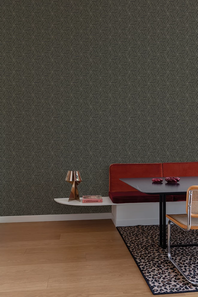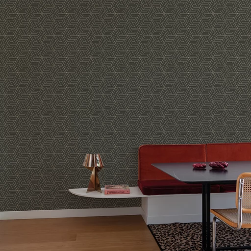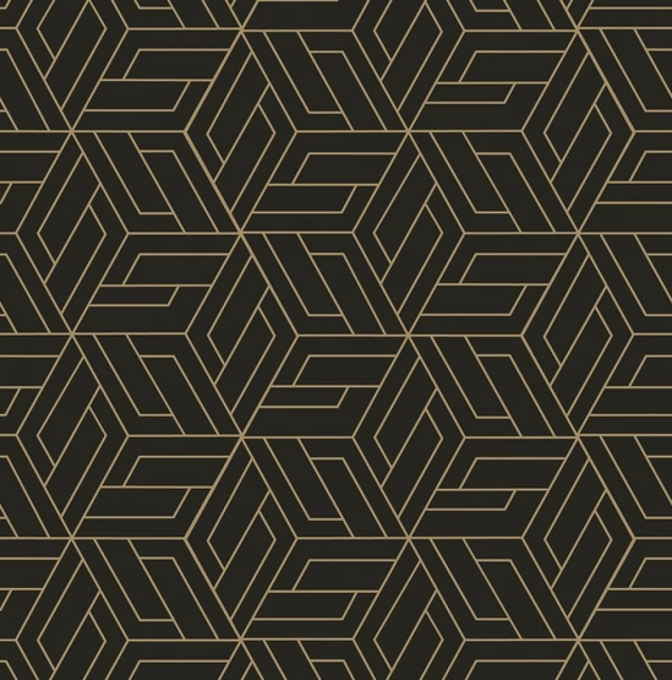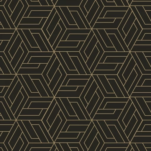 Tapeta przedstawiająca geometryczny wzór w odcieniach czerni i złota. Produkt firmy Grandeco. Tapeta winylowa na flizelinie.
