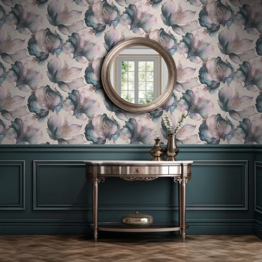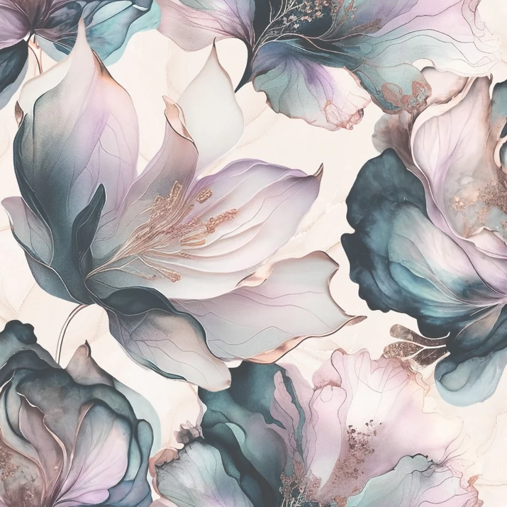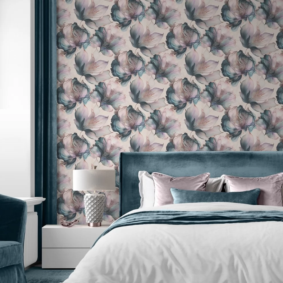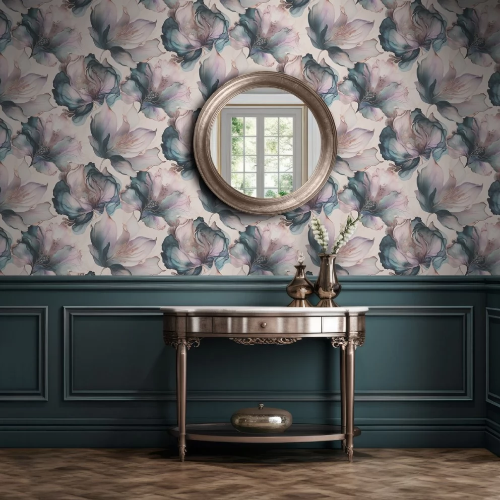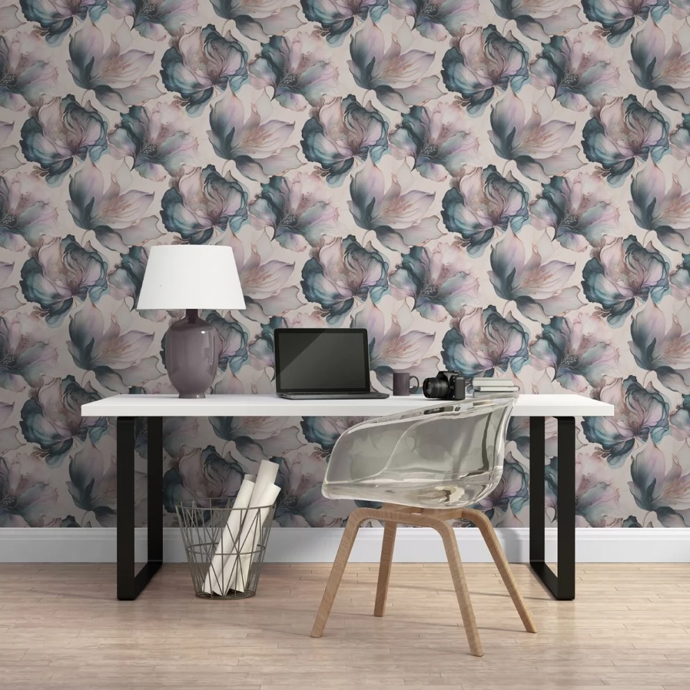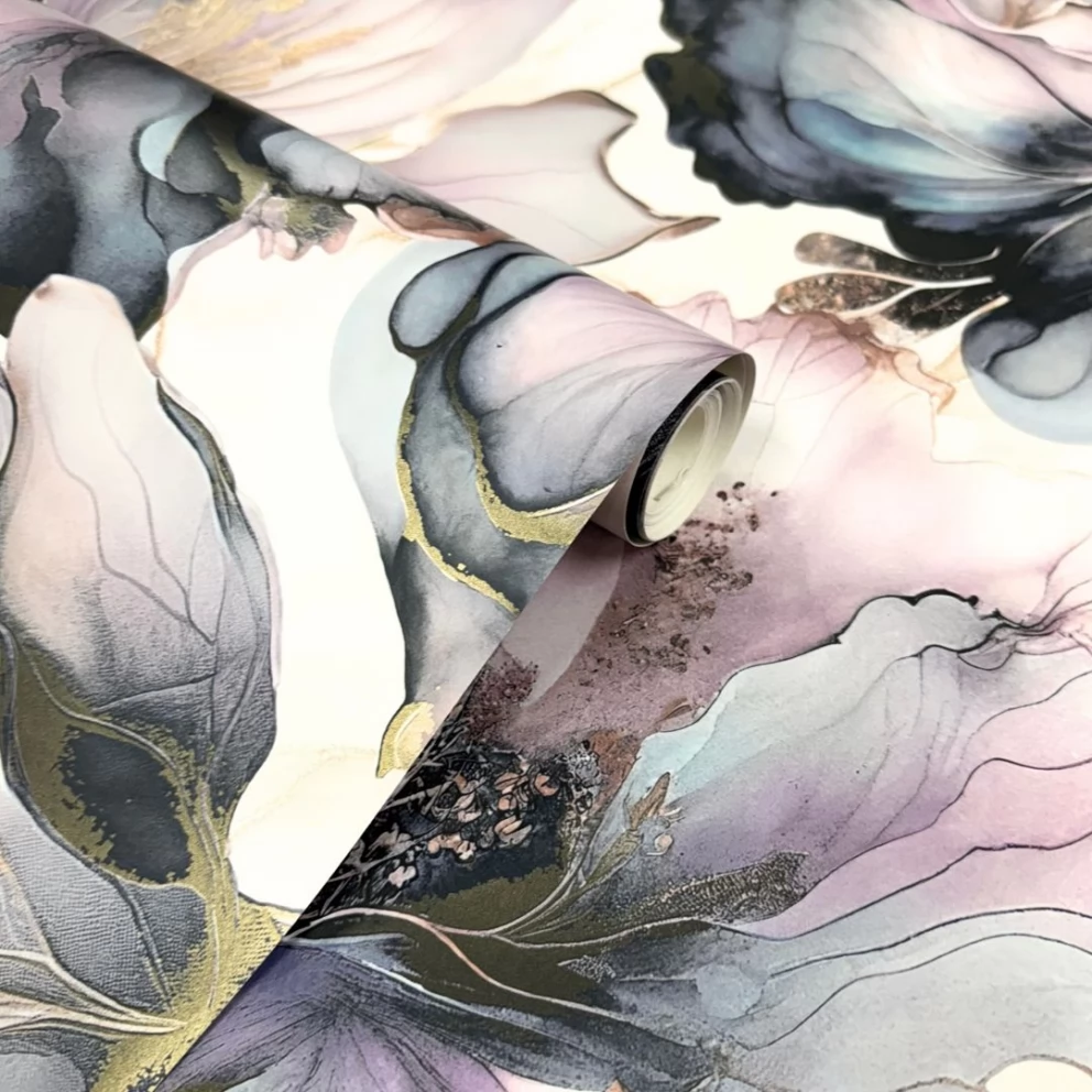 Wysokiej jakości papierowa tapeta francuskiej fabryki UGEPA. Elegancki motyw kwiatów w odcieniach różu, fioletu i niebieskiego ze złotymi dodatkami.