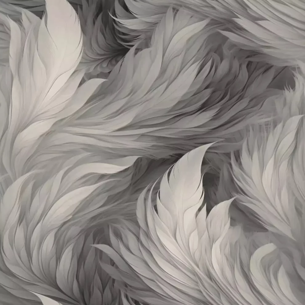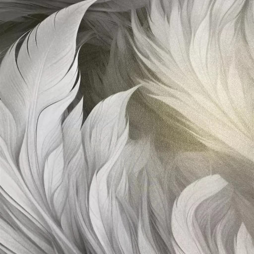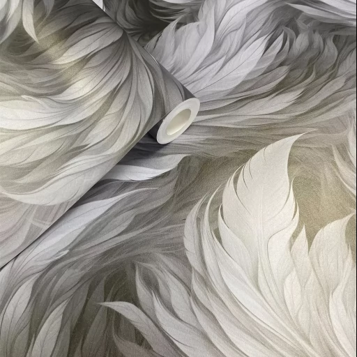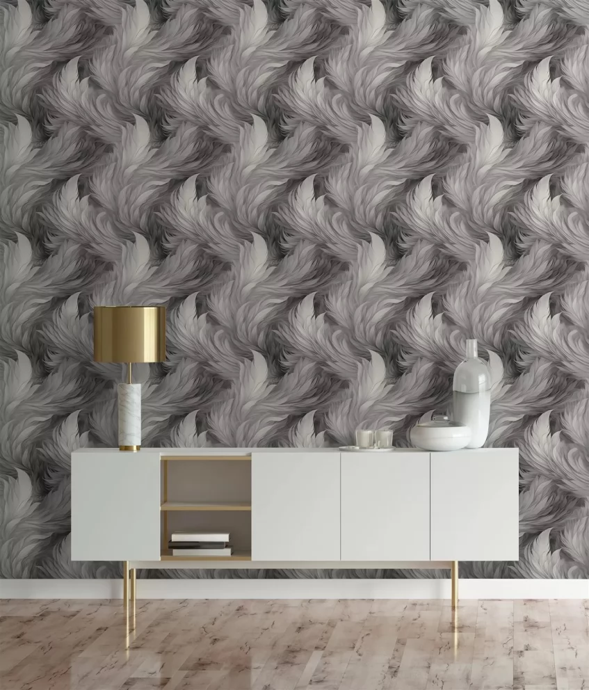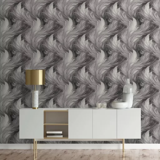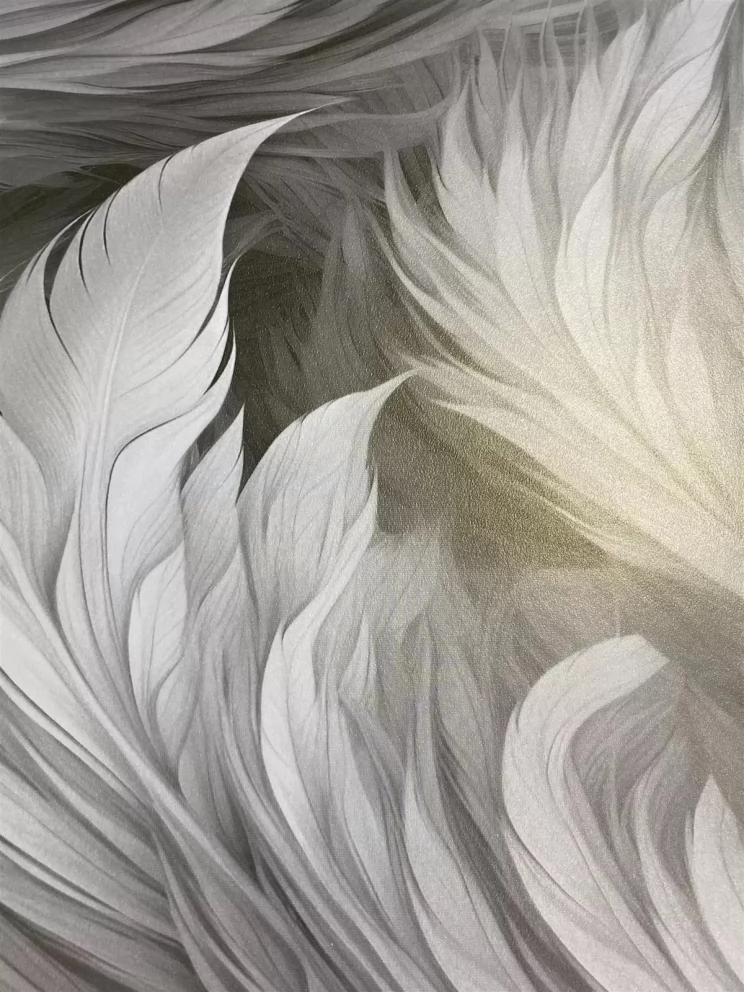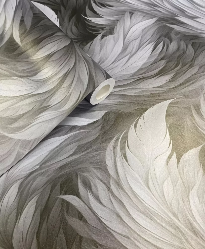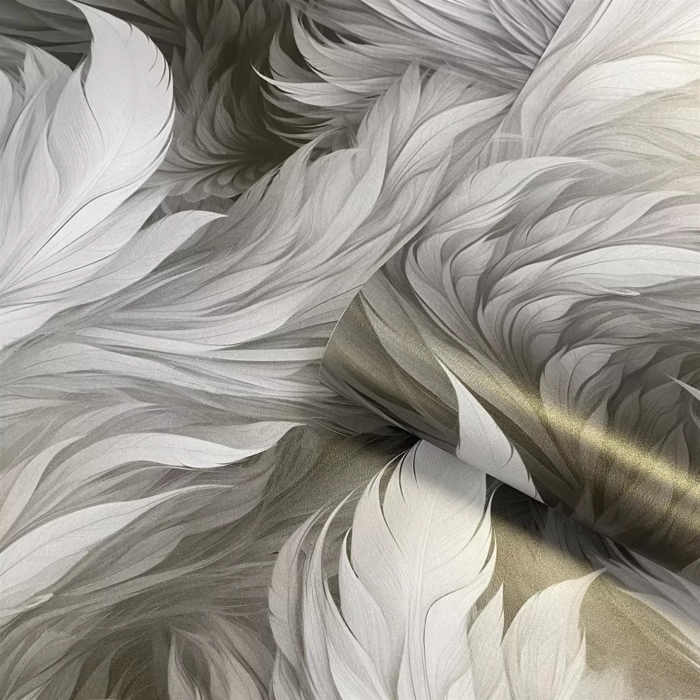 Wysokiej jakości papierowa tapeta francuskiej fabryki UGEPA. Elegancki motyw piór w odcieniach szarości i fioletu ze złotym połyskiem.