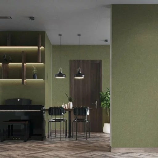 Akrylowa tapeta na flizelinie w spokojnych odcieniach zielonej oliwki i mchu. Cechuje się drobną teksturą, imitującą wygląd plecionej tkaniny. Tapeta posiada matowe wykończenie.