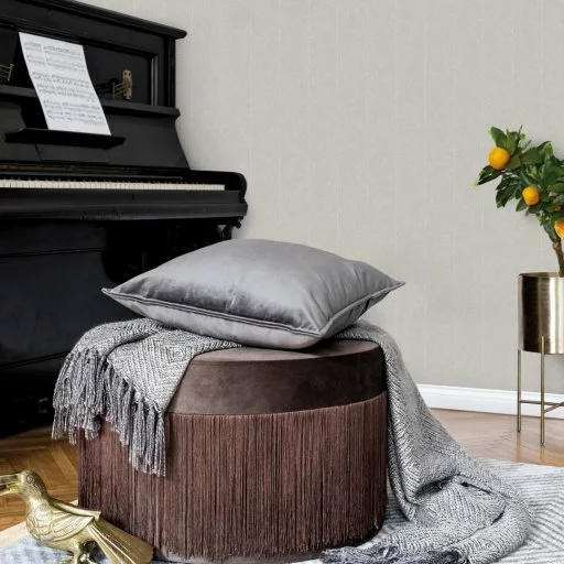 Akrylowa tapeta zręcznie naśladująca szarą jodełkową tkaninę. Wizualnie zdaje się posiadać teksturę grubego materiału z białymi przeszyciami. W rzeczywistości cechuje się gładkim, matowym wykończeniem.