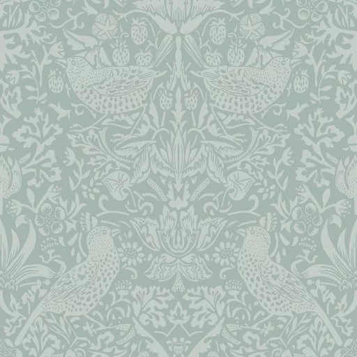 Gładka, matowa tapeta zainspirowana słynnym motywem z XIX wieku o tytule "Truskawkowy złodziej". Podobnie jak oryginał, przedstawia symetryczny motyw kwitnących krzewów, ożywiony elementami drobnych owoców i psocących drozdów. Współczesna forma i ciekawa kolorystyka dwóch odcieni patyny, łączy ponadczasowy szyk z elegancka prostotą.