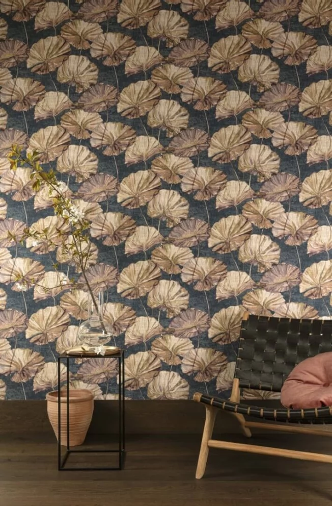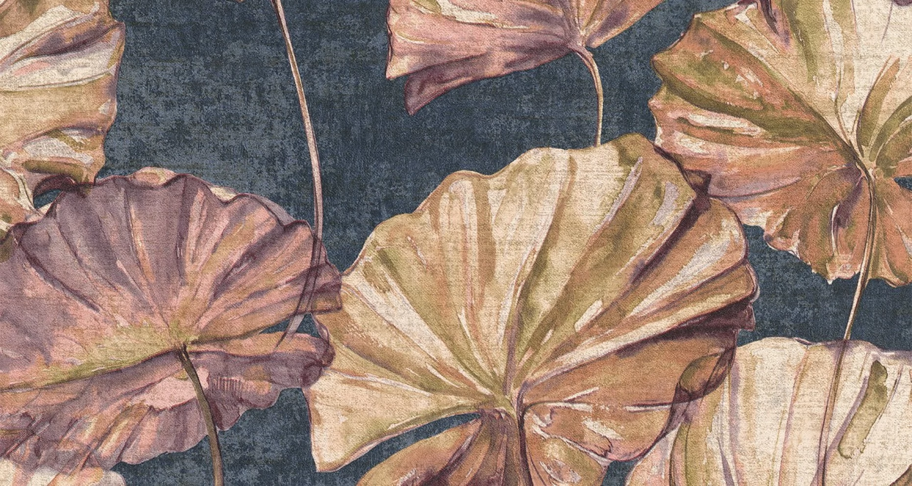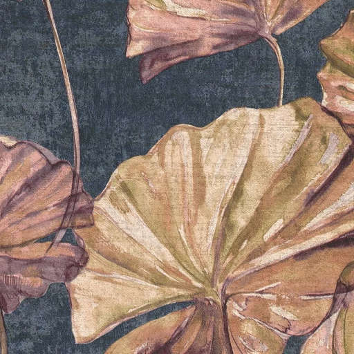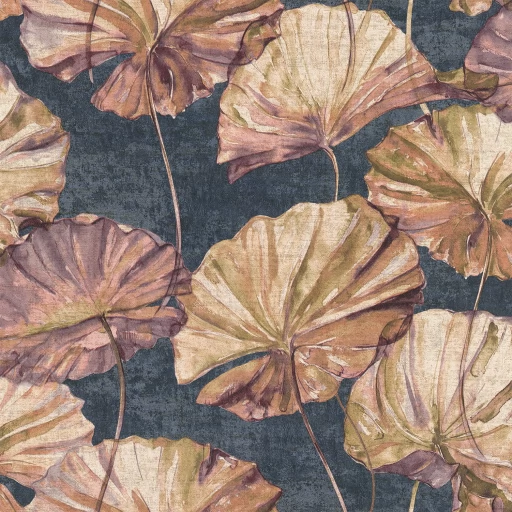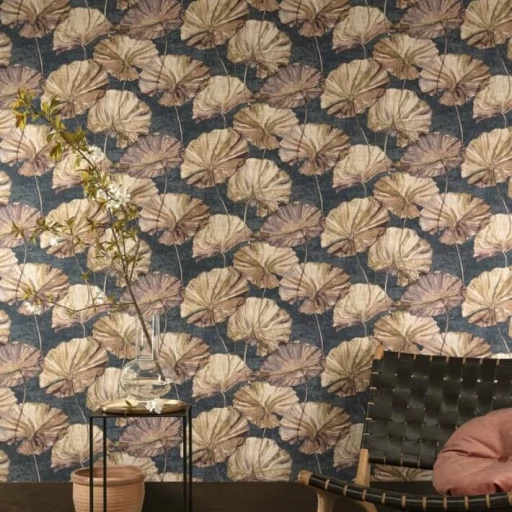 Tapeta przedstawiająca roślinny wzór w odcieniach granatu, fioletu, różu i beżu. Produkt firmy Grandeco. Tapeta winylowa na flizelinie.