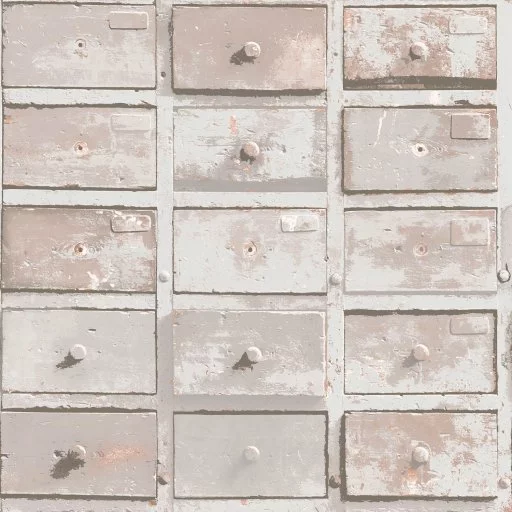 Tapeta imitująca małe szuflady w starym stylu. Struktura tej tapety jest zupełnie gładka i matowa.