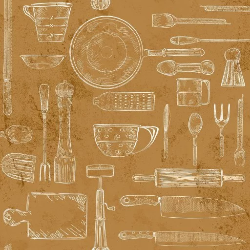 Tapeta w kolorze brązu w odcieniu ochry z naszkicowanymi przyborami kuchennymi. Idealna dekoracja do kuchni, jadalni czy stylowej restauracji.