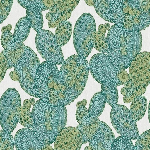 Tapeta przypominająca kaktusy z delikatnym, złotym połyskiem na gładkim tle przypominającym płótno.