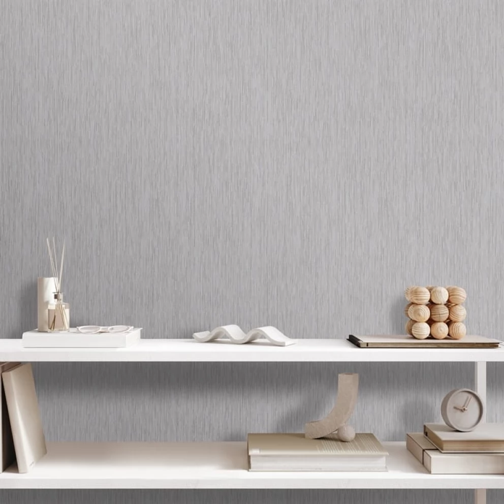 Winylowa, zmywalna tapeta niemieckiego producenta UGEPA. Wzór pełniący funkcję tła przedstawiający pionowe prążki w odcieniu szarości z dodatkiem srebrnego brokatu.