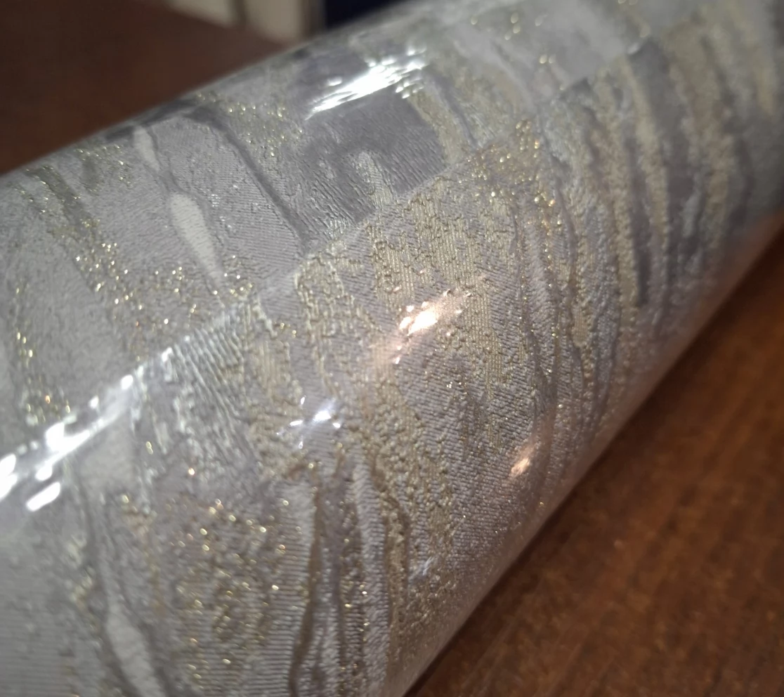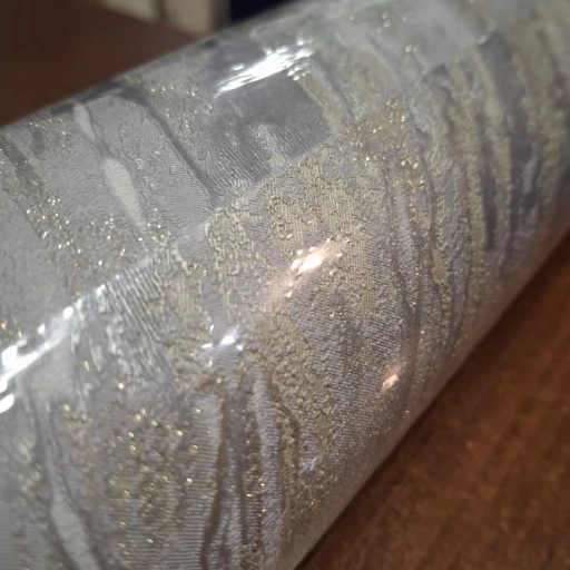 Motyw szarego marmuru z elementami złotego brokatu. Tapeta winylowa, dobrze zmywalna