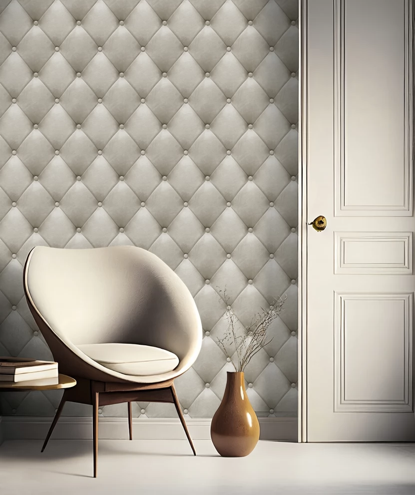 Winylowa, zmywalna tapeta francuskiego producenta UGEPA. Nowoczesny motyw z efektem 3D przedstawiający pikowaną beżową skórę.