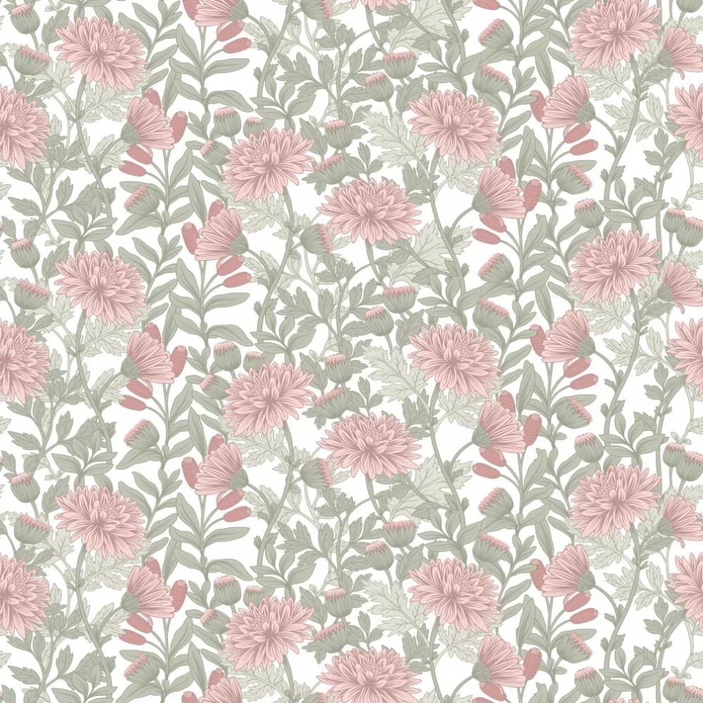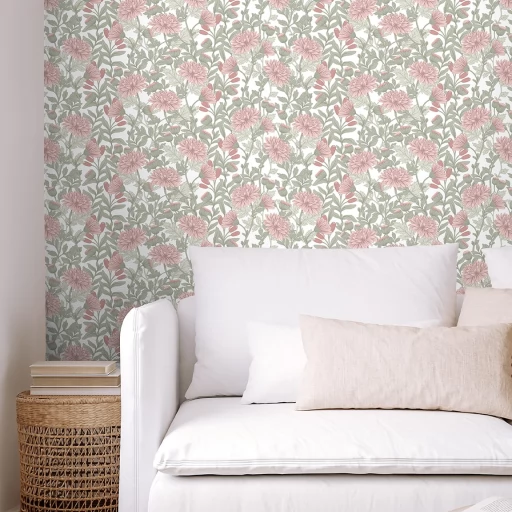 Winylowa, zmywalna tapeta francuskiego producenta UGEPA. Wzór przedstawiający roślinny motyw różowych kwiatuszków.